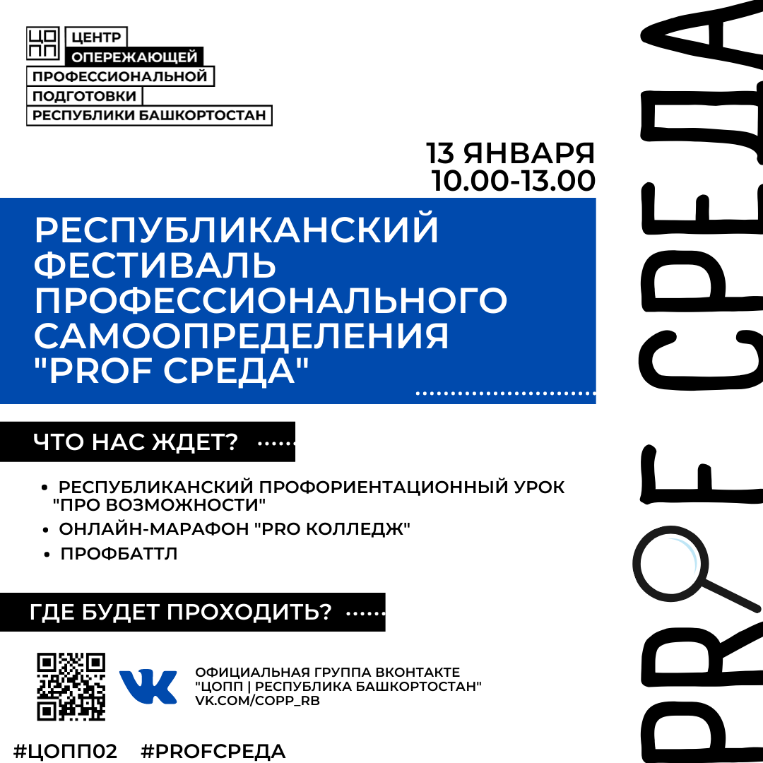 Приглашаем преподавателей, родителей и школьников 8-9 классов 13 января 2022 года на Онлайн фестиваль профессионального самоопределения "PROFсреда": https://vk.com/copp_rb?w=wall-193730666_10297 .В группе также разместим информацию о колледжах, участвующих в марафоне.