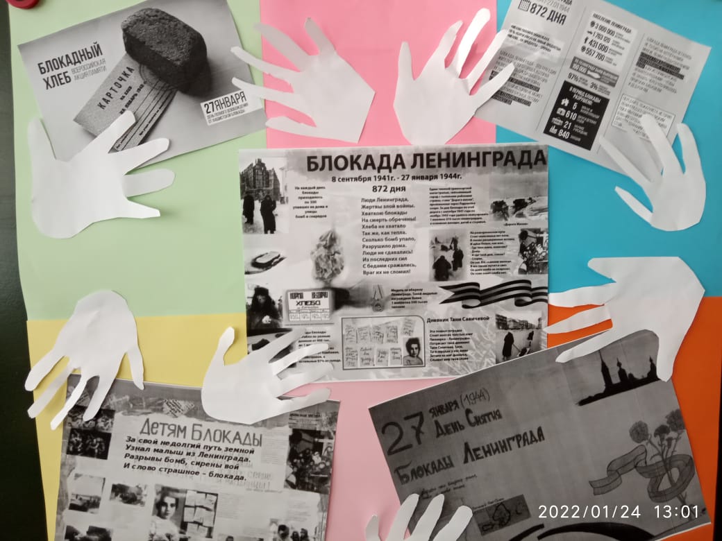 В рамках акции «Блокадный хлеб» в 1-10-х классах прошли Уроки Мужества, классные часы, беседы на тему «Блокадный хлеб», «Дневник Тани Савичевой», оформлен стенд «Блокада Ленинграда», минута молчания, просмотр документальных фильмов, презентаций, посвящённых блокаде Ленинграда, которые позволяют сегодняшнему поколению выразить благодарность за подвиг мирных граждан в годы Великой Отечественной войны.