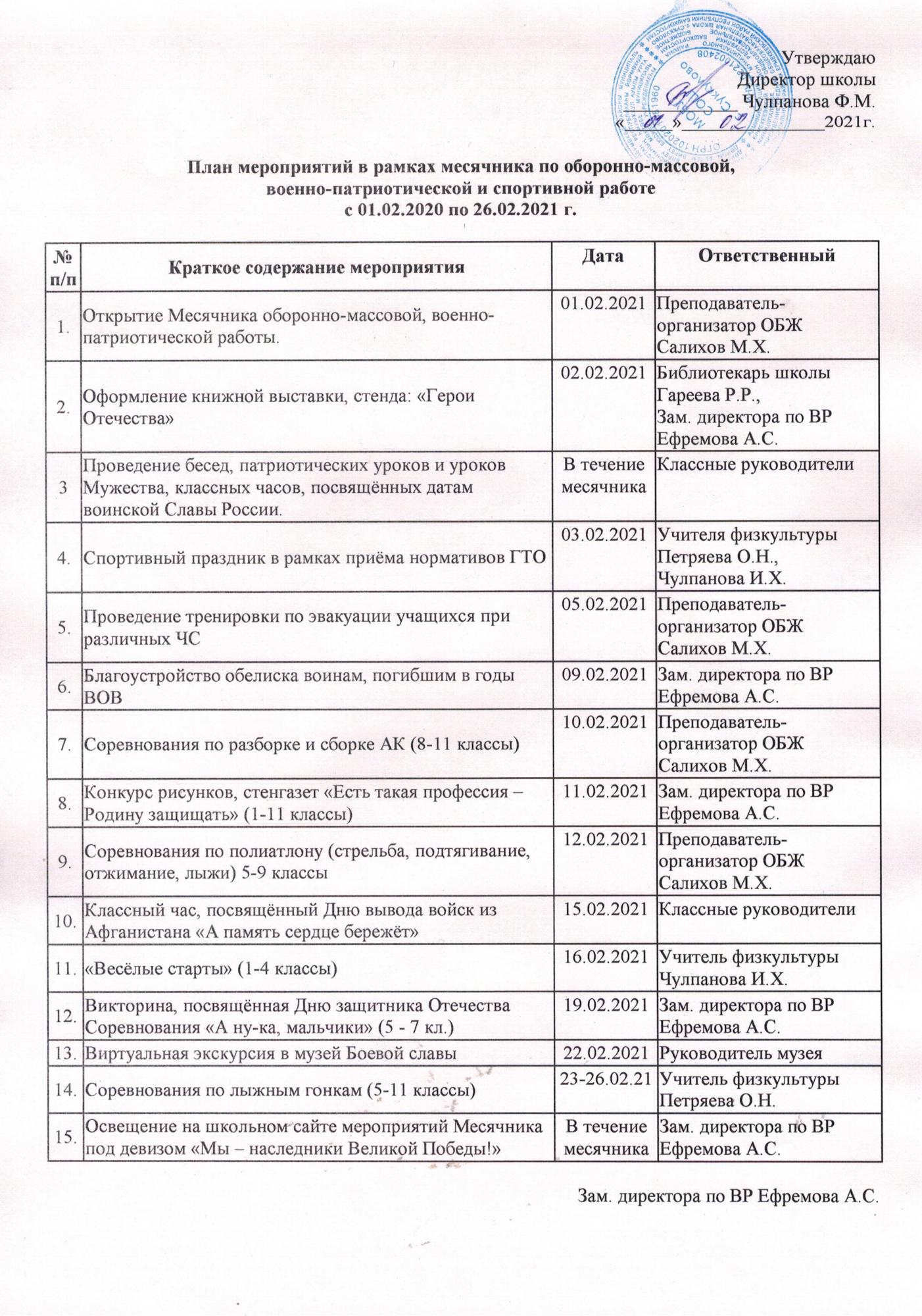 Одной из главных целей в воспитательной деятельности нашей школы является воспитание гражданско-патриотических качеств у школьников. Для реализации этой цели систематически организуются мероприятия, несущие гражданскую и военно-патриотическую направленность. Школа разработала план месячника по военно-патриотическому воспитанию школьников, направленный на формирование у подрастающего поколения любви к своей Родине, Отчему дому.